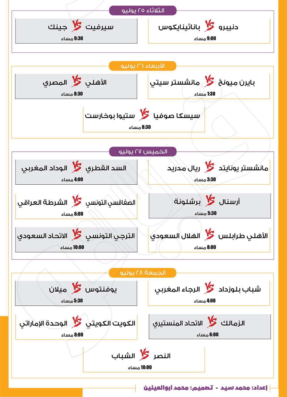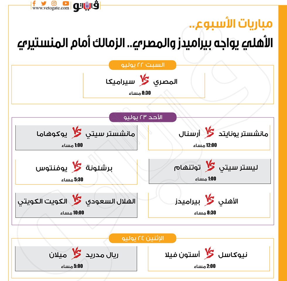 مباريات الأسبوع، الأهلي يواجه بيراميدز والمصري.. الزمالك أمام المنستيري (إنفوجراف) السبت 22/يوليو/2023 - 01:04 ص 7/22/2023 1:04:01 AM الزمالك، فيتو محمد سيد شارك طباعة 18 حجم الخط شارك طباعة الأهلي الزمالك بيراميدز الاتحاد المنستيري ريال مدريد برشلونة مانشستر يونايتد أرسنال