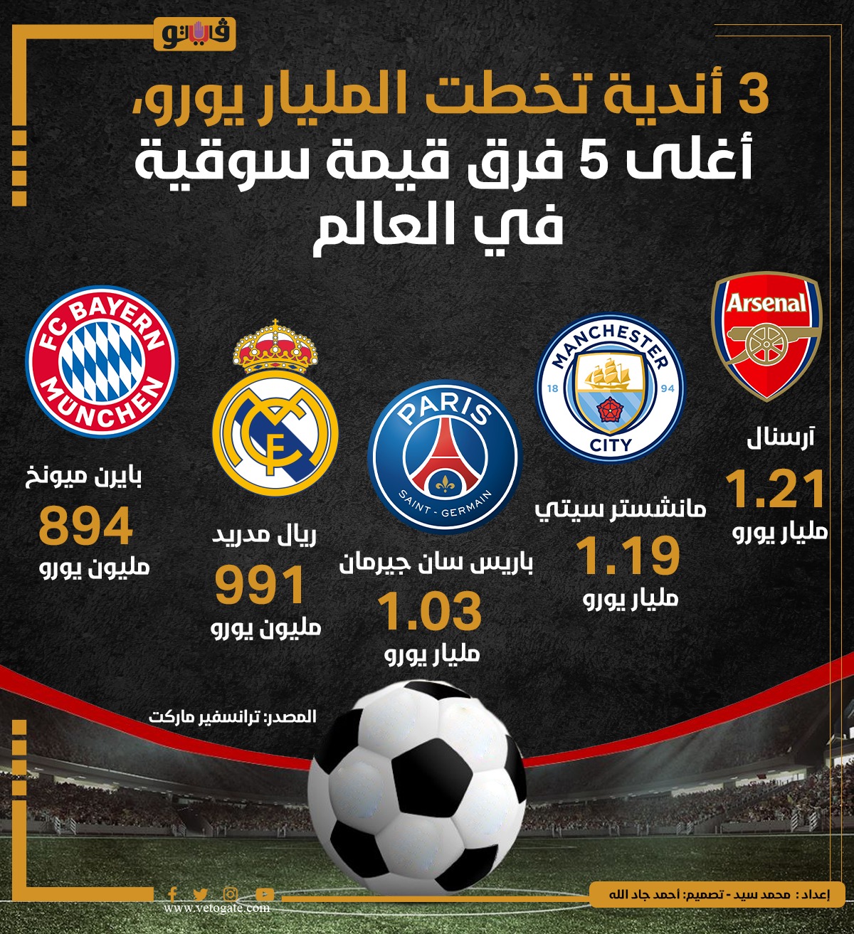 3 أندية تخطت المليار يورو، أغلى 5 فرق قيمة سوقية في العالم (إنفوجراف) الخميس 20/يوليو/2023 - 08:20 م 7/20/2023 8:20:33 PM آرسنال، فيتو محمد سيد شارك طباعة 18 حجم الخط شارك طباعة أرسنال ريال مدريد مانشستر سيتي بايرن ميونخ باريس سان جيرمان