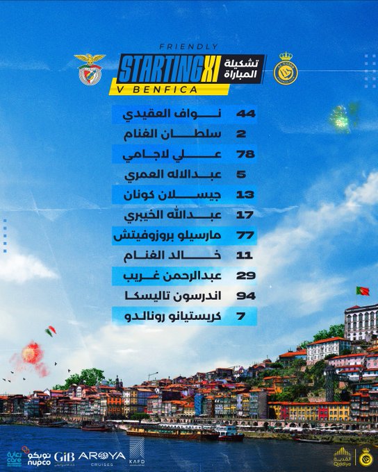 وكان البرتغالي لويس كاسترو المدير الفني لفريق النصر السعودي، أعلن عن تشكيل العالمي لمواجهة بنفيكا البرتغالي، مساء اليوم الخميس، على ملعب ألجارفي، في المباراة الودية التي تجمع الفريقين استعدادا للموسم الجديد 2023-2024.