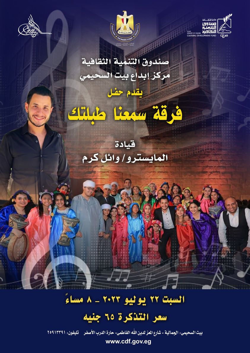 يقيم مركز ابداع بيت السحيمي بشارع المعز، والتابع لقطاع صندوق التنمية الثقافية في تمام الثامنة من مساء غدا السبت الموافق 22 يوليو الجاري، حفل لفرقة "سمعنا طبلتك".