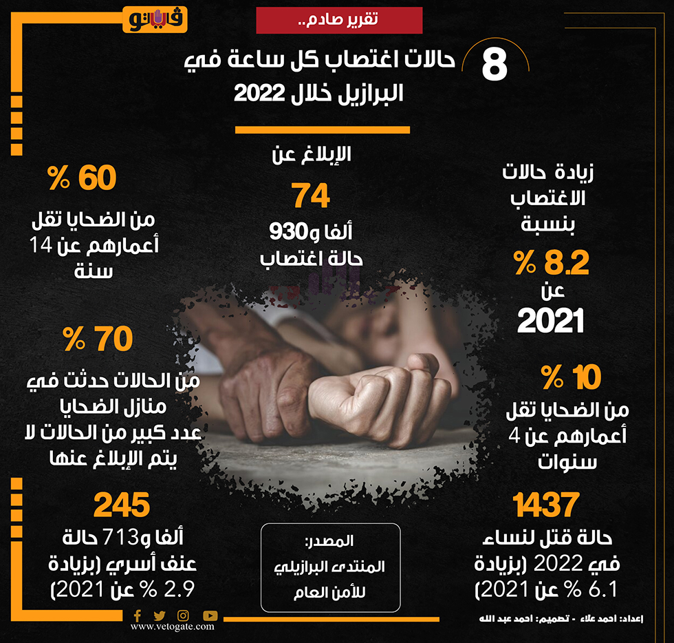 تقرير صادم.. 8 حالات اغتصاب كل ساعة في البرازيل خلال 2022 ( انفوجراف) الأحد 23/يوليو/2023 - 12:34 م 7/23/2023 12:34:51 PM حالات الاغتصاب في البرازيل، فيتو احمد علاء شارك طباعة 18 حجم الخط شارك طباعة البرازيل المنتدى البرازيلي للأمن العام تسجيل حالات الاغتصاب في البرازيل حالات الاغتصاب في البرازيل الشرطة البرازيلية