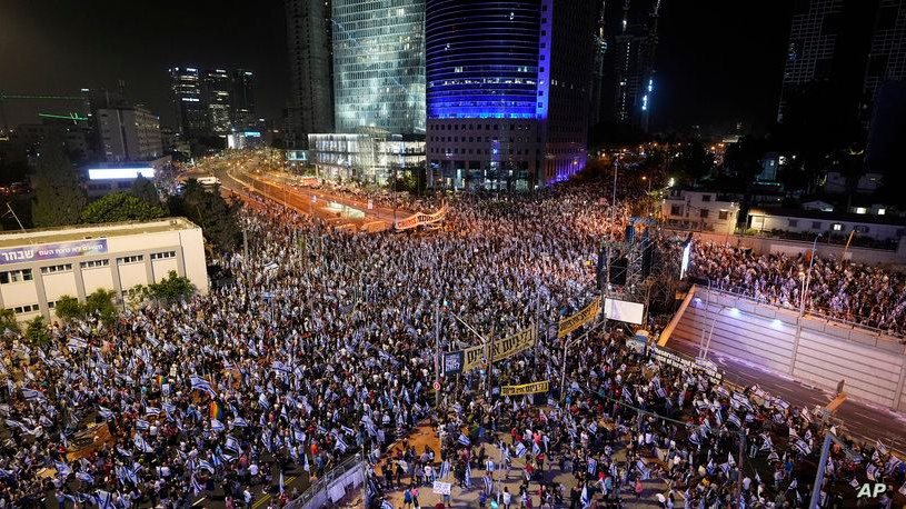 وعقب 28 أسبوعا من اندلاع التظاهرات التي ضربت موعدا مساء السبت من كل أسبوع، تغير الحال الأسبوع الجاري لتظل التظاهرات مستمرة في شوارع إسرائيل فضلا عن إعلان العديد من القطاعات الحيوية والجيش الإسرائيلي الإضراب عن العمل من اجل ايقاف مساعي حكومة نتنياهو تقليص سلطات القضاء، وهو الأمر الذي يراه المحللون الإسرائيليون من شأنه أن يضر بالديمقراطية في إسرائيل، إلى أن وصل الأمر لتوجيه إدانات متتالية من إدارة الرئيس الأمريكي جو بايدن والتي تعتبر أقوى حليف في العالم لتل أبيب أدى إلى عدم دعوة نتنياهو لزيارة البيت الأبيض وهو أمر غير مسبوق في تاريخ العلاقات بين الدولتين.