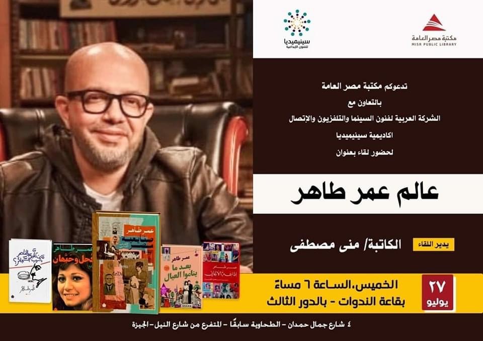 تستضيف مكتبة مصر العامة بالجيزة، في تمام السادسة من مساء يوم الخميس المقبل الموافق 27 يوليو الجاري، ندوة ولقاء تحت عنوان “عالم عمر طاهر” بحضور الكاتب عمر طاهر لمناقشة وتوقيع أعماله، والحديث عن مسيرته الإبداعية.