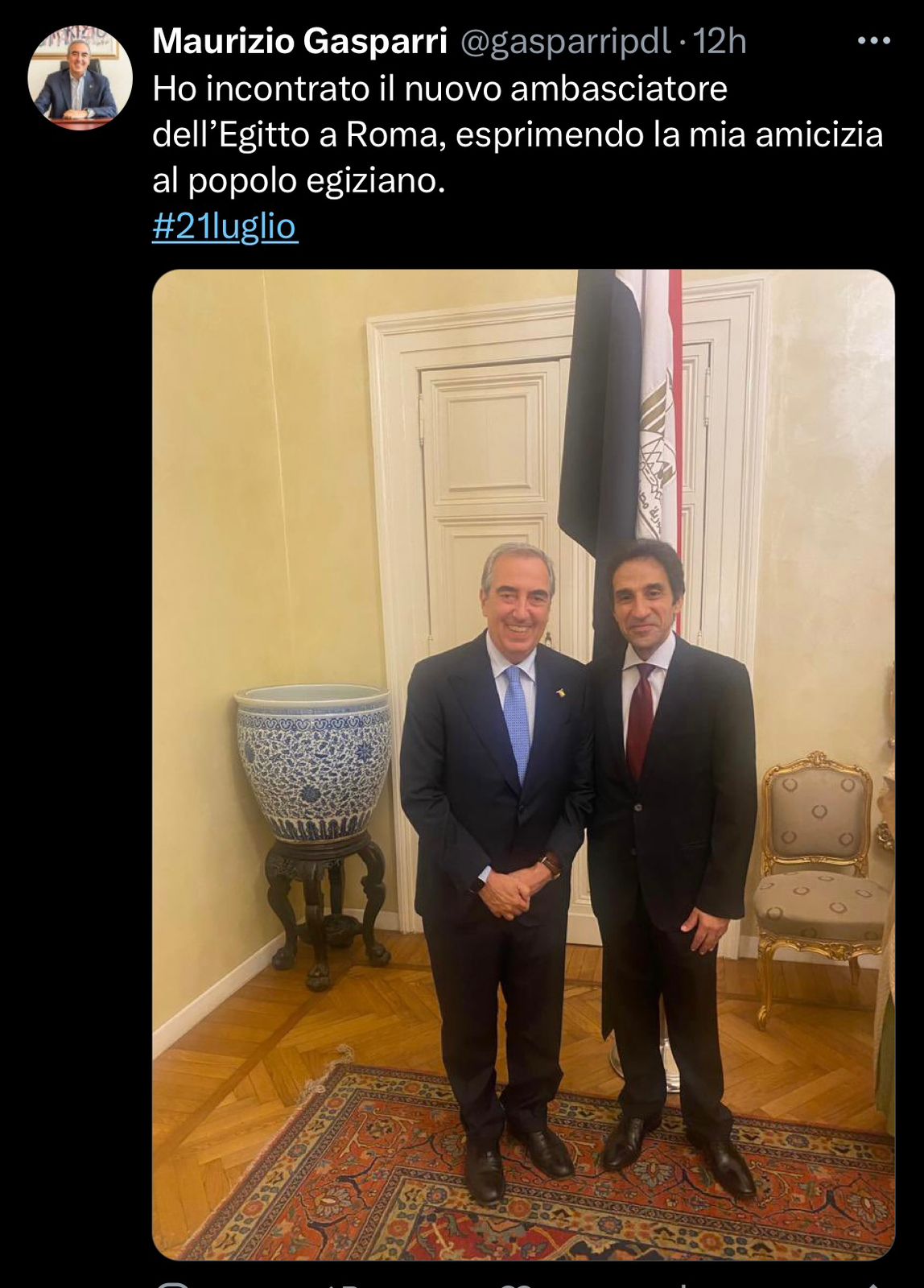 صرح السفير بسام راضي أن ثورة يوليو أسست لقيام الجمهورية الأولى فى عام ١٩٥٢، وتشهد مصر حاليا ومنذ عام ٢٠١٤ بقيادة السيد الرئيس عبدالفتاح السيسي جهود استراتيجية متكاملة ودقيقة الاركان والتفاصيل للانطلاق نحو الجمهورية الجديدة وتاسيس الدولة الحديثة، مضيفًا ان مصر تعتز بشراكتها التاريخية الممتدة مع ايطاليا وتطلع لتطويرها في كافة المجالات.
