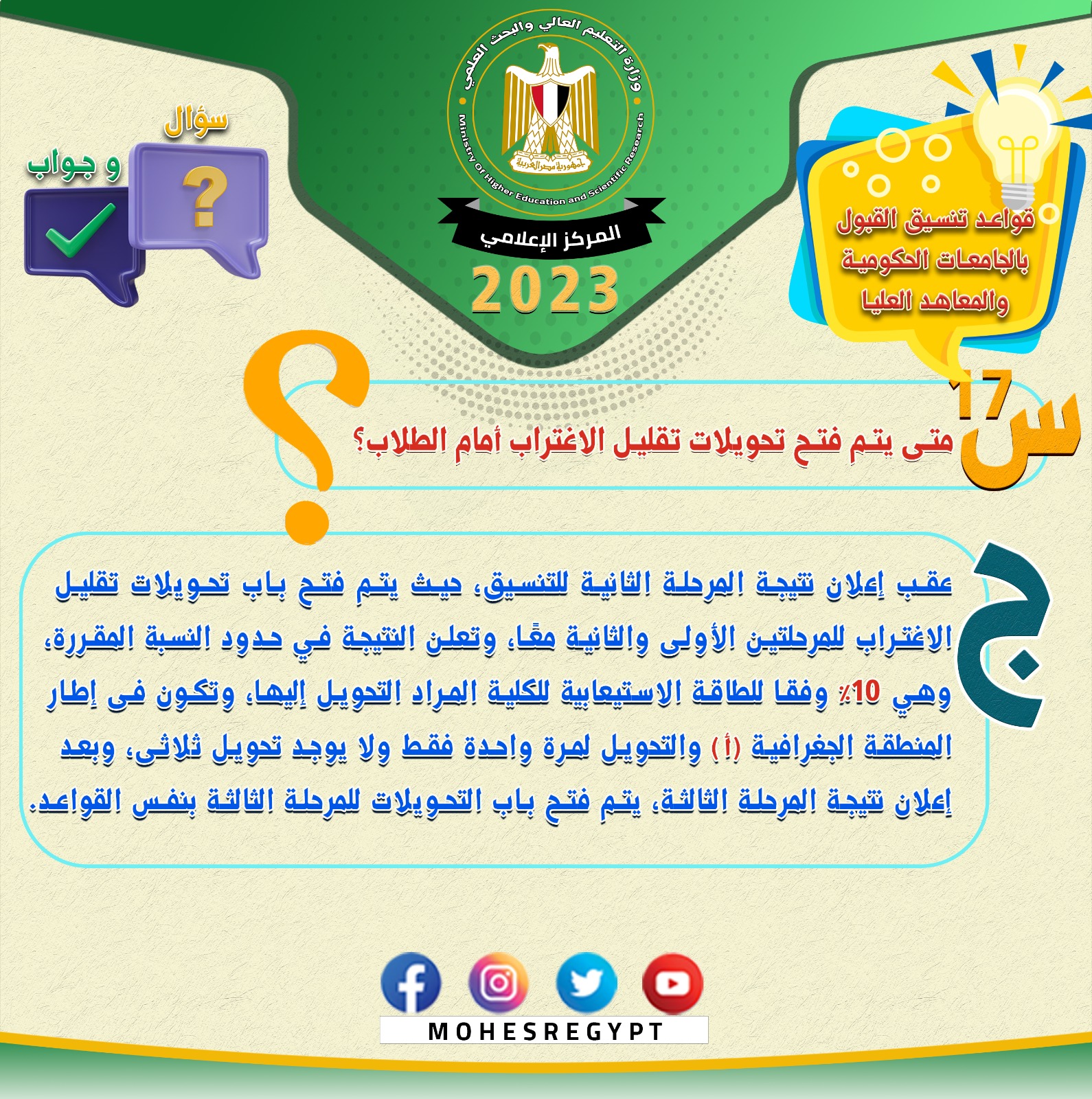 ويأتي ذلك في إطار استمرار استعدادات وزارة التعليم العالي والبحث العلمي لتنسيق القبول بالجامعات الحكومية والمعاهد لطلاب الثانوية العامة المصرية، وتعريف الطلاب بكافة المعلومات التي تساعدهم أثناء مراحل التنسيق المُختلفة.