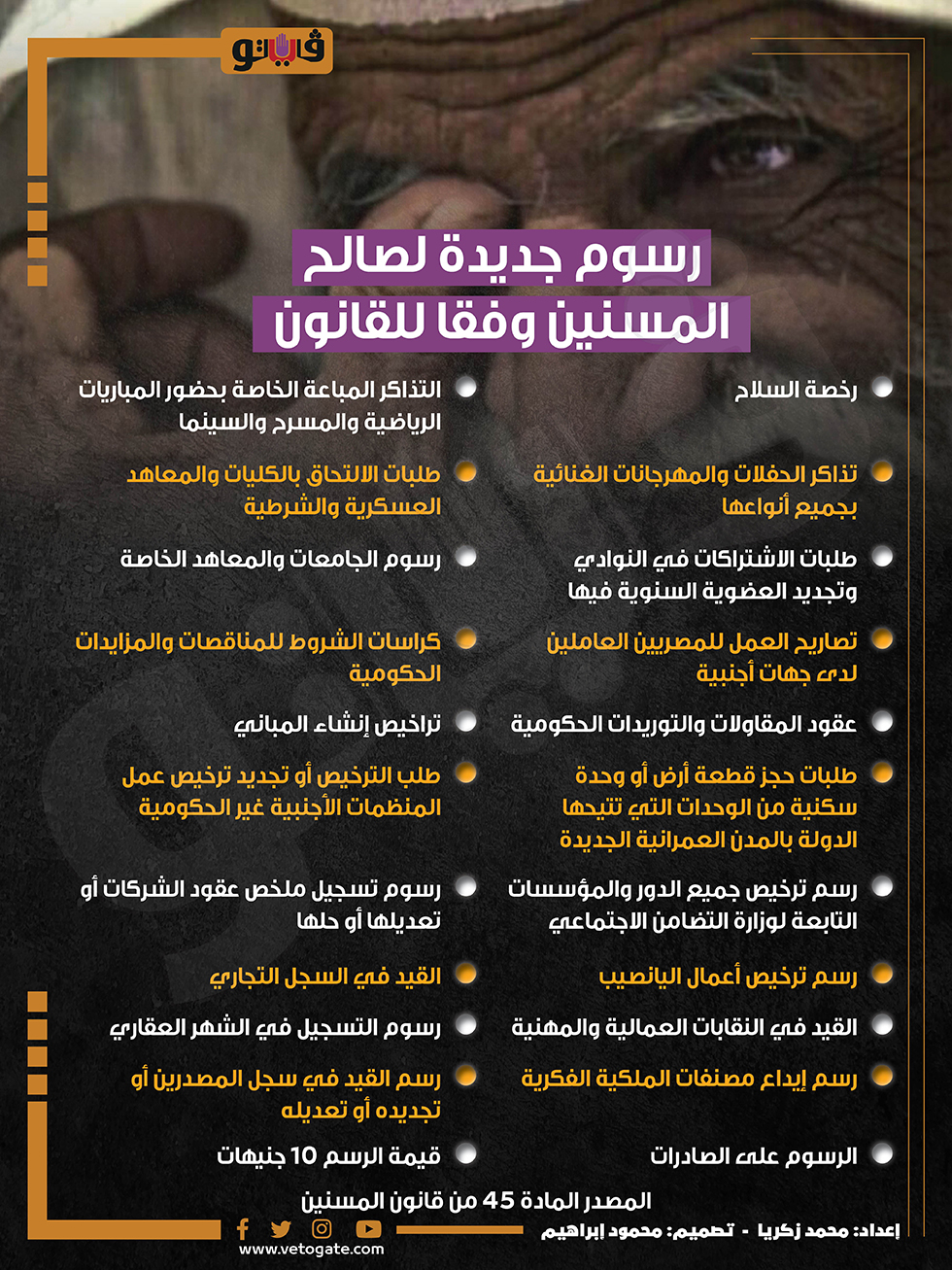 رسوم جديدة لصالح المسنين وفقا للقانون (إنفوجراف) السبت 22/يوليو/2023 - 09:45 م 7/22/2023 9:45:17 PM المسنين، فيتو محمد زكريا شارك طباعة 18 حجم الخط شارك طباعة التسجيل في الشهر العقاري الجامعات والمعاهد التوريدات الحكومية الكليات والمعاهد العسكرية المدن العمرانية الجديدة المعاهد الخاصة رسوم التسجيل في الشهر العقاري قانون المسنين
