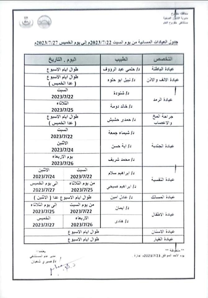 وجاء الجدول بتخصيص عيادة باطنة وأسنان وغيار وعيادة النفسية وعيادة الأطفال طوال أيام الأسبوع في استقبال المواطنين، بينما عيادتي الأنف والأذن وجراحة المخ والأعصاب طوال أيام الأسبوع ماعدا الخيمس، بينما عيادة المسالك طوال أيام الأسبوع ماعدا الإثنين.