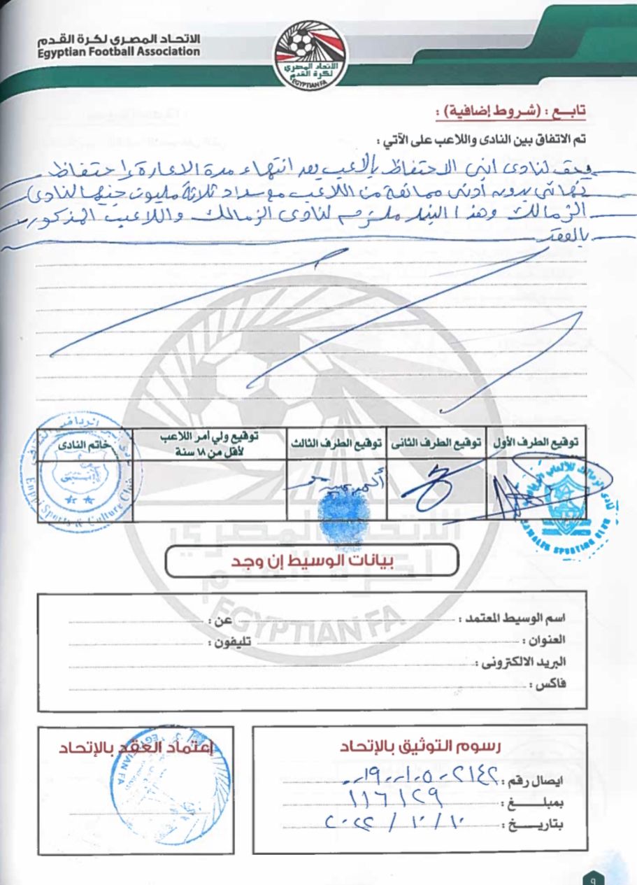 وقال المصدر: "لا نريد الدخول في مشاكل مع الزمالك نظرًا للعلاقة الطيبة بين الناديين ولكن العقد شريعة المتعاقدين وبالتالي فإن قيام انبي بوضع 3 ملايين جنية في اتحاد الكرة لتفعيل العقد يكون من حق النادي قيد اللاعب في القائمة الجديدة للموسم المقبل".