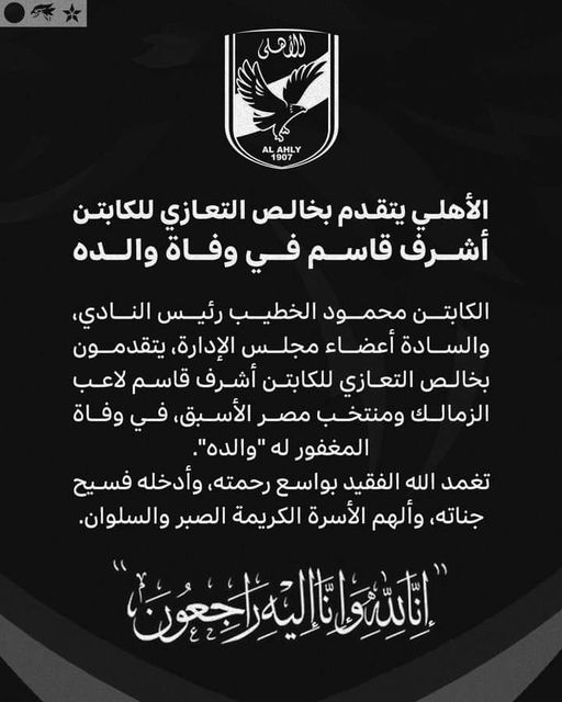 تقدم الكابتن محمود الخطيب رئيس النادي الأهلي والسادة أعضاء مجلس الإدارة بخالص التعازي للكابتن أشرف قاسم لاعب الزمالك ومنتخب مصر الأسبق، في وفاة المغفور له "والده".