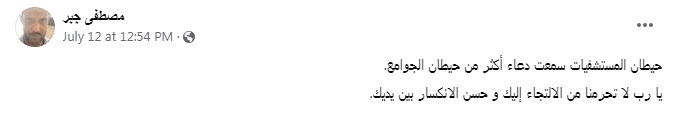 كانت آخر كلمات الدكتور مصطفى جبر "حيطان المستشفيات سمعت دعاء أكثر من حيطان الجوامع.. يا رب لا تحرمنا من الالتجاء إليك وحسن الانكسار بين يديك"، بعدها بأيام أسلم مصطفى جبر روحه لخالقه، وهو في ريعان شبابه بعد معاناة من قصور في وظائف الكلى.