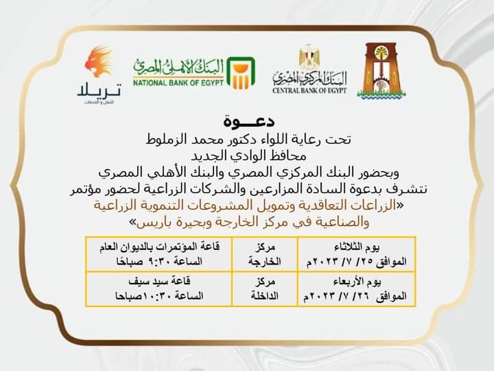 والصناعية في مركز الخارجة وبحيرة باريس»، وذلك يومي الثلاثاء والأربعاء المقبلين، تحت رعاية اللواء دكتور محمد الزملوط محافظ الوادي الجديد، وبحضور ممثلي البنك المركزي المصري والبنك الأهلي المصري.