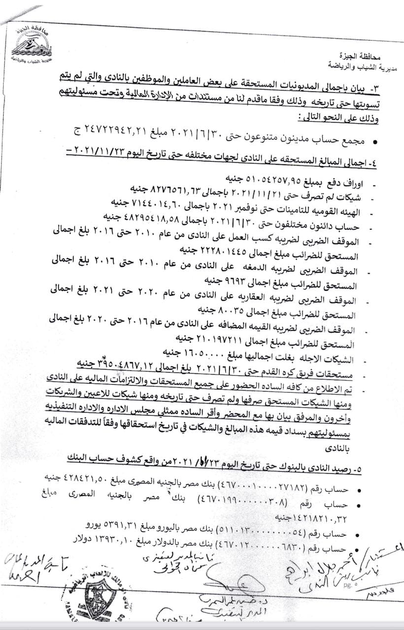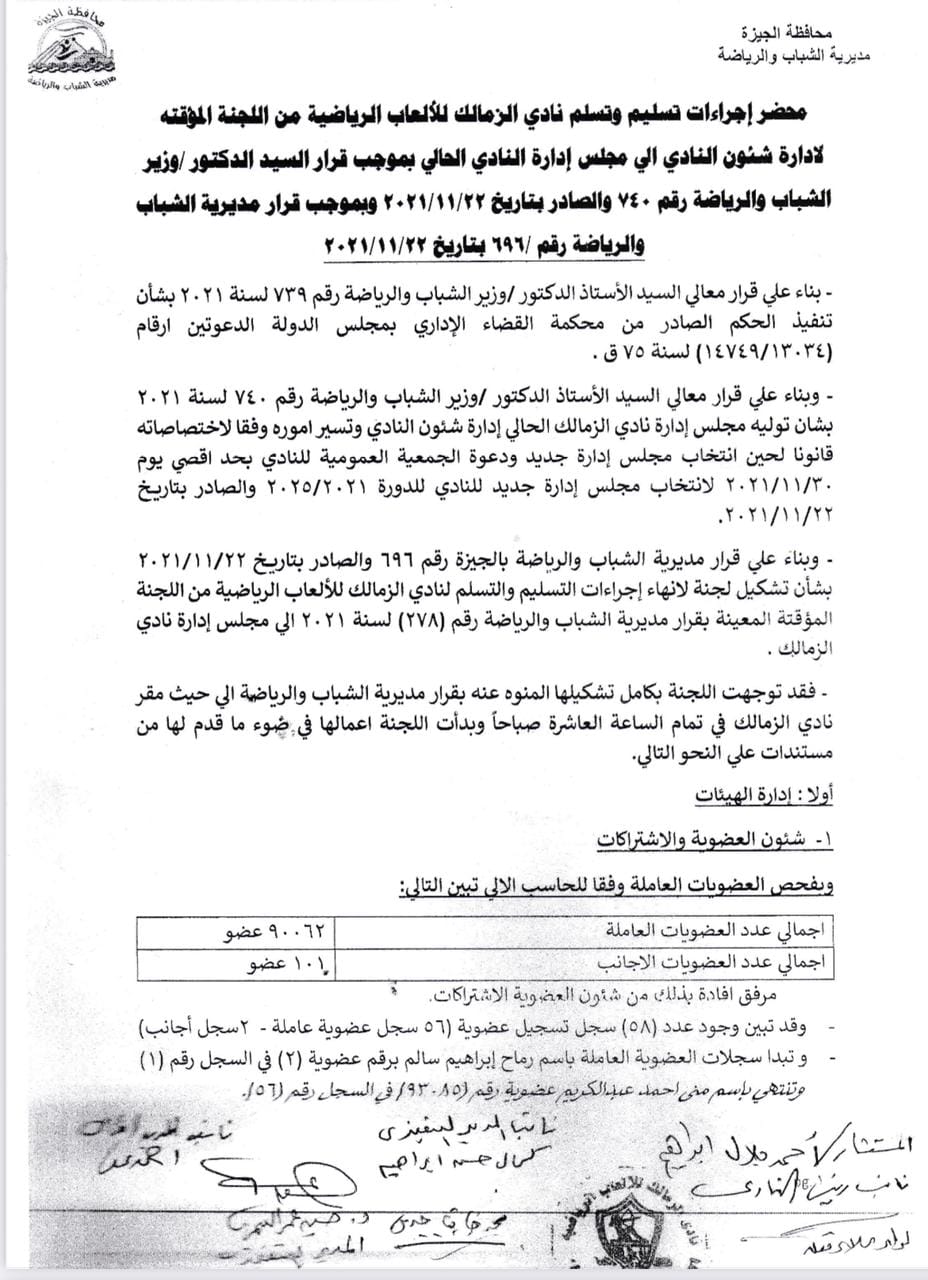 وننشر من خلال المستندات محضر إجراءات تسليم وتسلم نادي الزمالك من اللجنة المؤقتة لإدارة شؤون نادي الزمالك إلى مجلس الإدارة بموجب قرار وزير الشباب والرياضة رقم 740 الصادر بتاريخ 22 نوفمبر عام 2021 وذلك على النحو التالي: