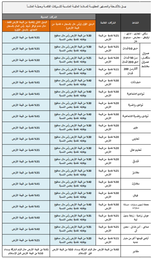 أكدت هيئة المجتمعات العمرانية الجديدة على انه يجب ان تكون الملاءة المالية مناسبة متى استوفت المتطلبات وفقا لنشاط قطعة الأرض وحالة الشركة (قائمة – حديثة) وذلك وفقا للبيان التفصيلي التالي: