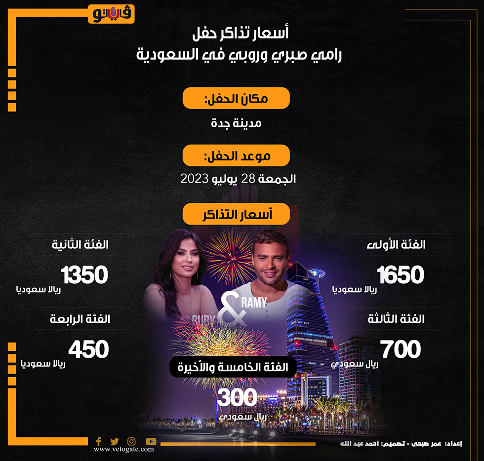 أسعار تذاكر حفل رامي صبري وروبي في السعودية (انفو جراف) الإثنين 24/يوليو/2023 - 03:08 م 7/24/2023 3:08:37 PM رامي صبري وروبي، فيتو عمر صبحي شارك طباعة 18 حجم الخط شارك طباعة رامي صبري الفنان رامي صبري حفلات رامي صبري روبي