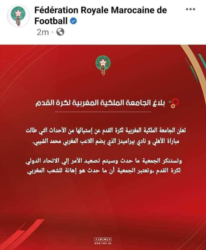 أصدر الاتحاد المغربي لكرة القدم بيانا رسميا بشأن الأحداث التي شهدتها مباراة فريقي الأهلي وبيراميدز أمس الأحد وواقعة حسين الشحات لاعب الاحمر والمغربي محمد الشيبي لاعب الفريق السماوي