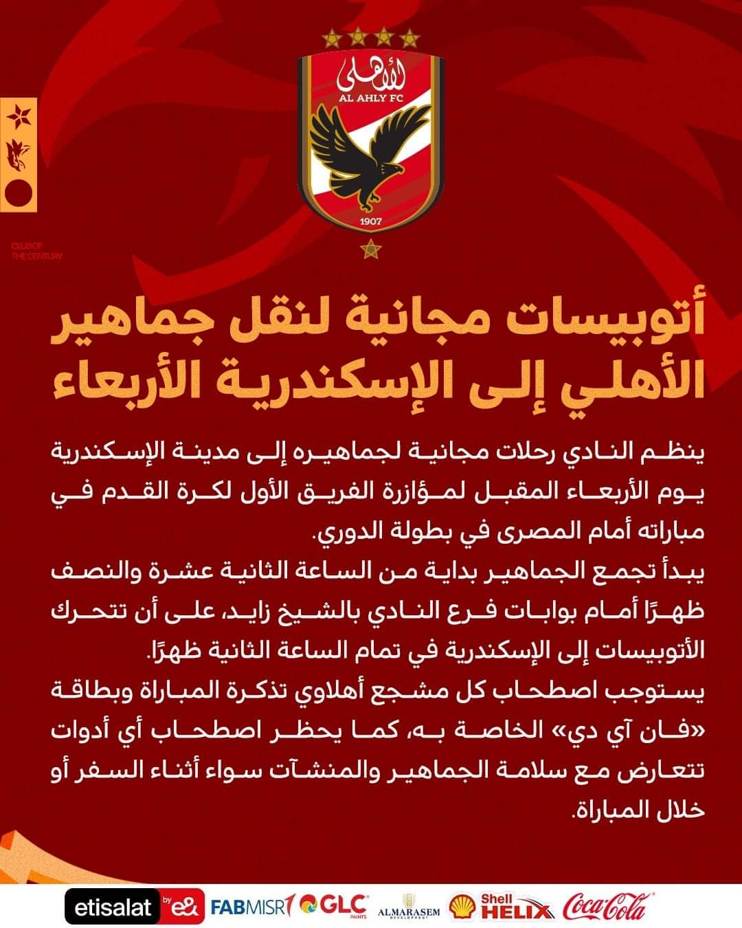 وتم توفير الأتوبيسات لنقل جماهير الأهلي إلى ستاد برج العرب يوم الأربعاء المقبل.