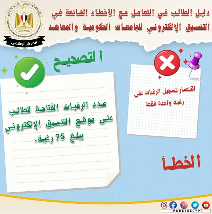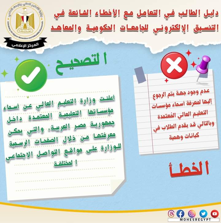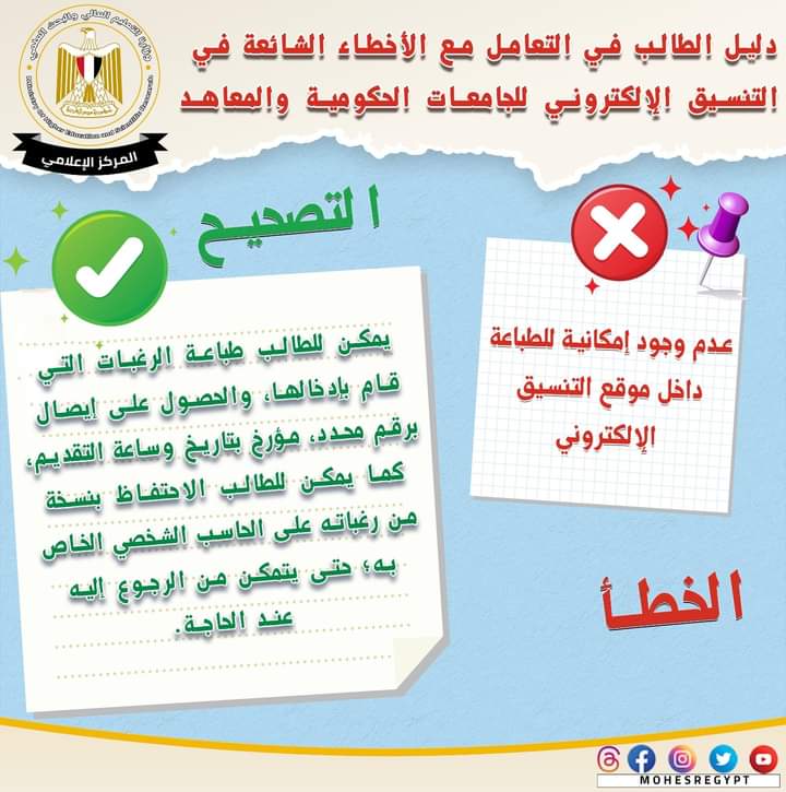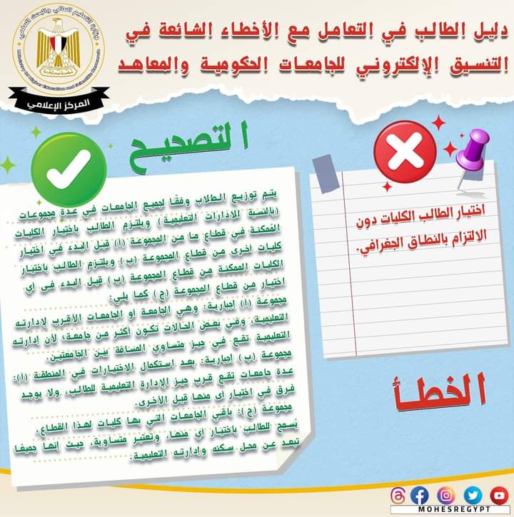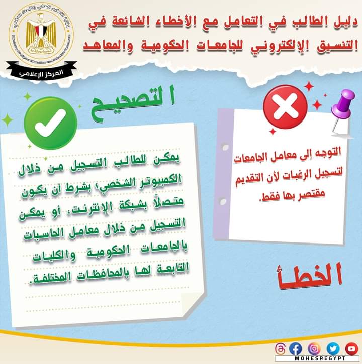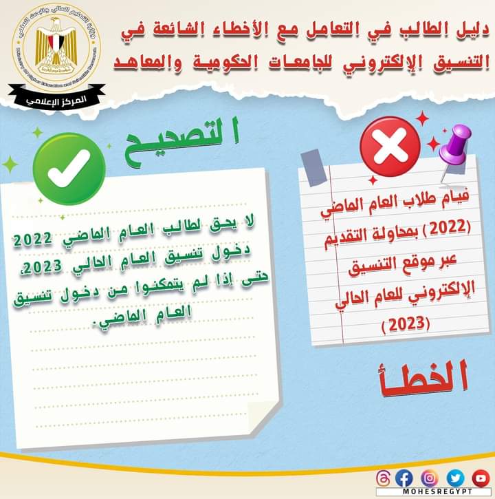 تنسيق الجامعات 2023، نشرت وزارة التعليم العالي دليلًا حول كيفية التعامل مع الأخطاء الشائعة في تنسيق القبول بالجامعات الحكومية والمعاهد لطلاب الثانوية العامة.