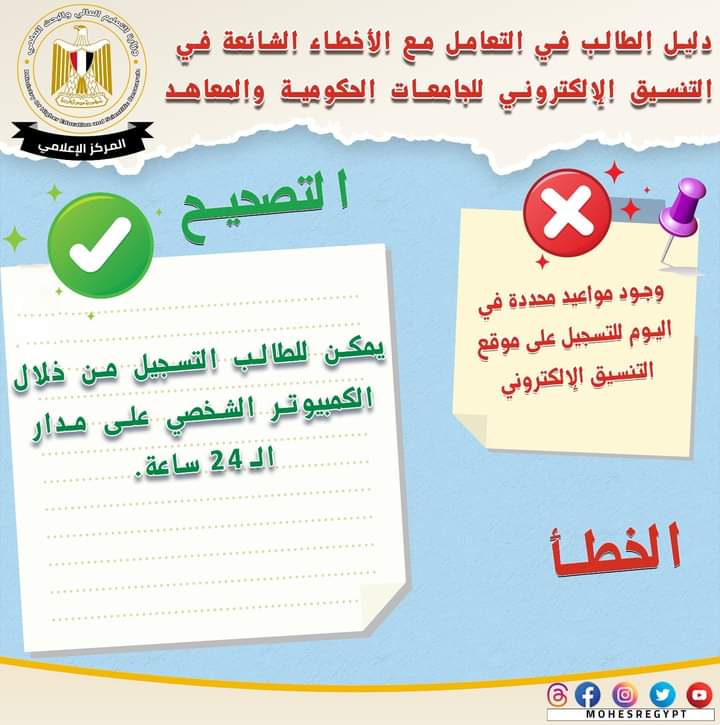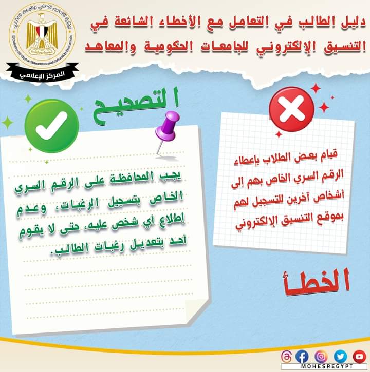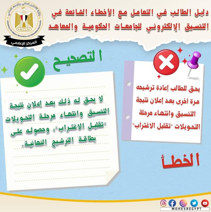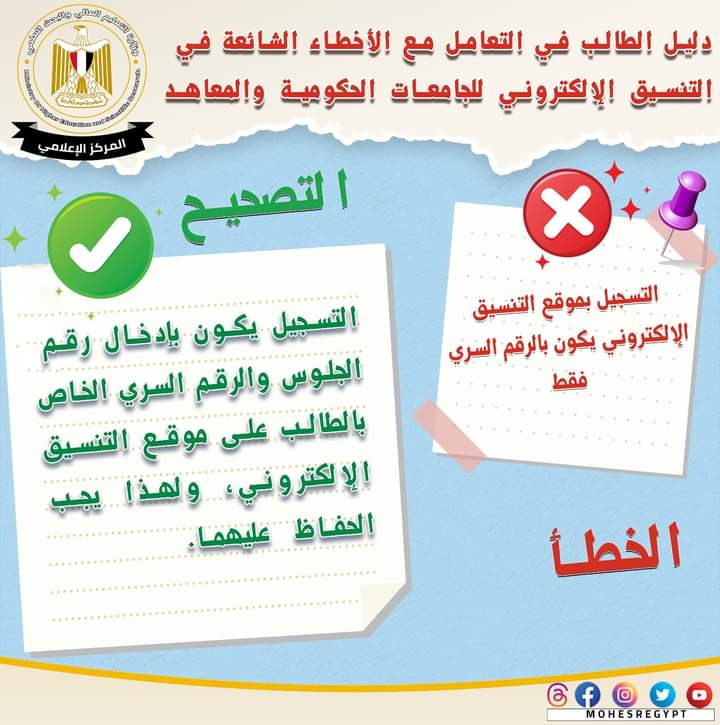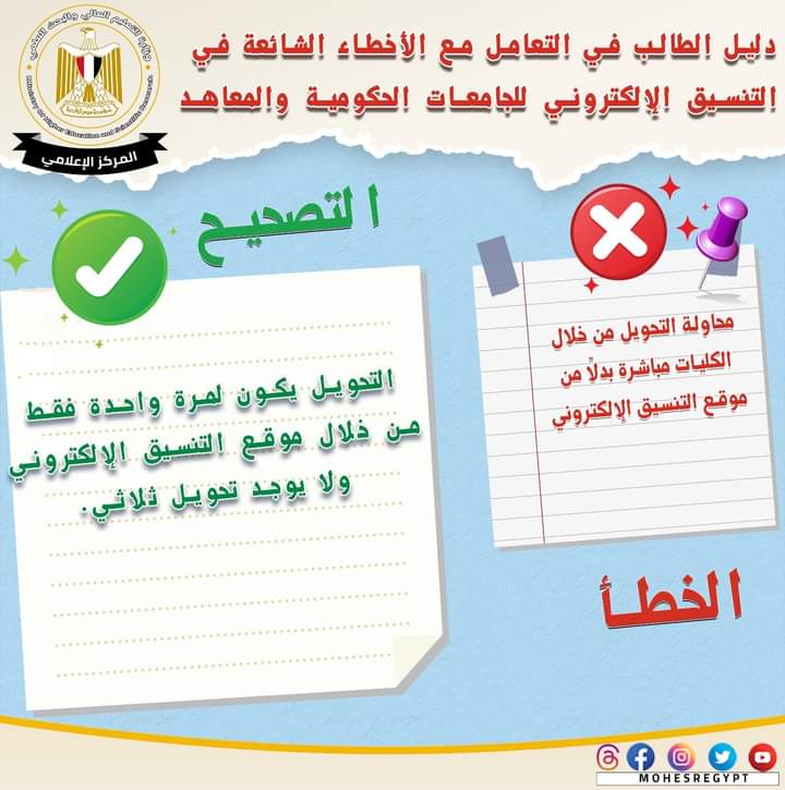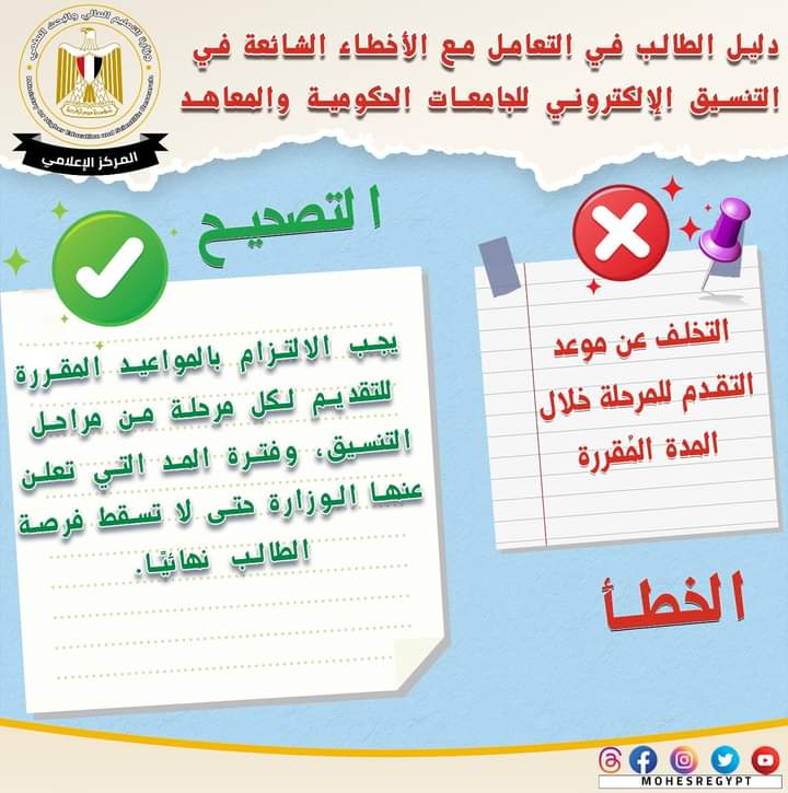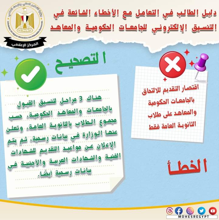 تنسيق الجامعات 2023، نشرت وزارة التعليم العالي دليلًا حول كيفية التعامل مع الأخطاء الشائعة في تنسيق القبول بالجامعات الحكومية والمعاهد لطلاب الثانوية العامة.