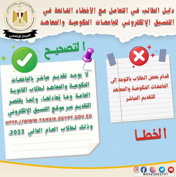 وصرح د. عادل عبدالغفار المستشار الإعلامي والمتحدث الرسمي للوزارة أن المركز الإعلامي للوزارة يواصل حملته التوعوية لتعريف طلاب الثانوية العامة بكيفية التنسيق للقبول بالجامعات الحكومية والمعاهد من خلال موقع التنسيق الإلكتروني https://tansik.digital.gov.eg