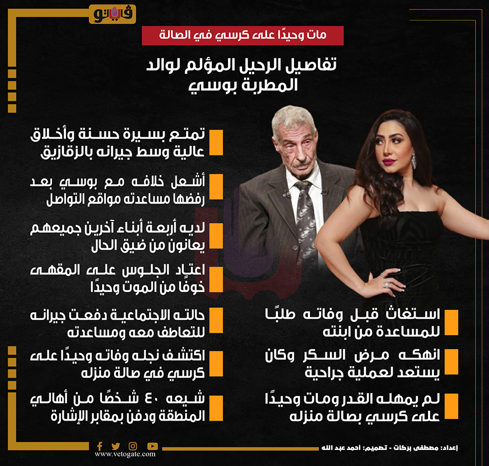 وكان والد بوسي استنجد من خلال وسائل التواصل الاجتماعى “فيس بوك” بأبنائه لرعايته في شيخوخته بعد تدهور صحته قبل الرحيل وقال: “بوسى مقاطعانى ومش بترد عليا وعملالى بلوك على التليفون وأنا محتاج المساعدة وأنا أبوها”.