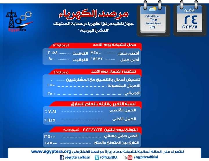 وأضاف مرفق جهاز تنظيم الكهرباء وحماية المستهلك أنه تم تخفيف الاحمال بقدار 3 آلاف ميجاوات الجمعة الماضية حيث وصلت الأحمال الكهربائية إلى 32 ألفا و900 ميجاوات، قبل أن تعود الأحمال الكهرباء للارتفاع 34 ألفا و600 ميجاوات.