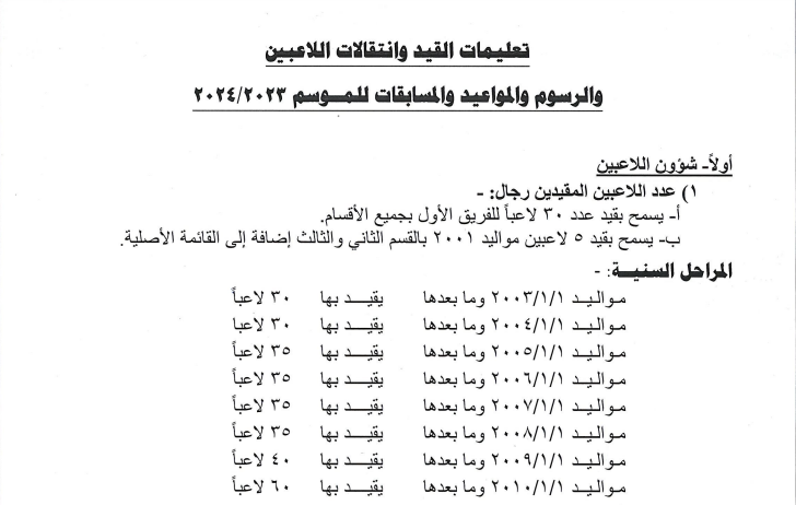 وتشمل تعليمات القيد قوائم مسابقات الناشئين والبراعم ومواعيد القيد لكافة الأقسام مستحقات الحكام للموسم القيد وغيرها من الإجراءات.