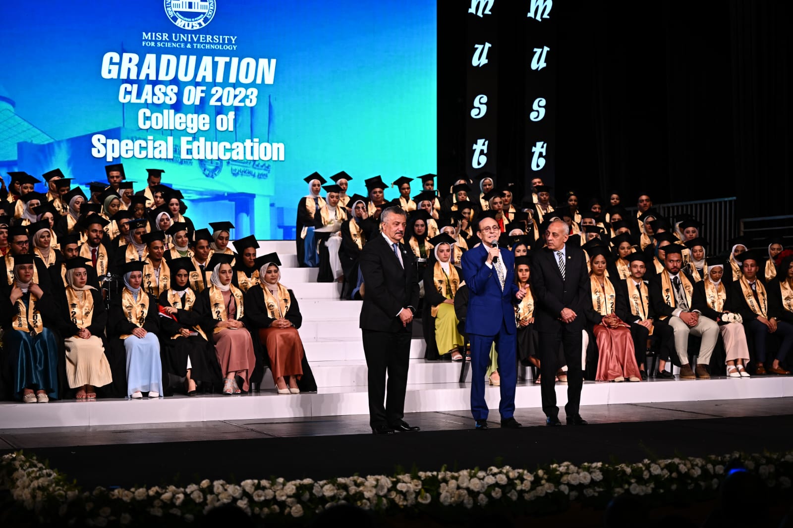 وقدم الدكتور شريف شاهين، عميد كلية التربية الخاصة جامعة مصر للعلوم والتكنولوجيا، التحية لضيوف الحفل، كما هنأ الطلاب وأولياء أمورهم على التخرج والاستعداد لخوض الحياة العملية بعد أن تم تأهيلهم على أعلى مستوى داخل الكلية من خلال توفير كل الدعم لهم من خلال دعم رئيس مجلس الأمناء خالد الطوخي، حيث تم تدريب الطلاب على برامج تواكب العصر الحديث في علوم التربية الخاصة ومعامل تعتمد بشكل أساسي على الاهتمام بذوي القدرات الخاصة، تمكن الخريجين من امتلاك الأدوات التي تساعدهم على التسلح بكل ما هو جديد داخل سوق العمل، مشيرًا إلى أنه انطلاقا من أهمية ذوي الاحتياجات ودورهم في المجتمعات المتقدمة اهتمت الدولة بهذه الفئة المتميزة في كافة خططها التنموية، وكان لزامًا على المؤسسات التربوية في مصر العمل على تقديم الخريجين المؤهلين لتيسير التواصل والتعامل معهم كحق أصيل لهم ودمجهم في المجتمع بما يضمن توظيف قدراتهم الخاصة وطاقاتهم الإبداعية الخلاقة.