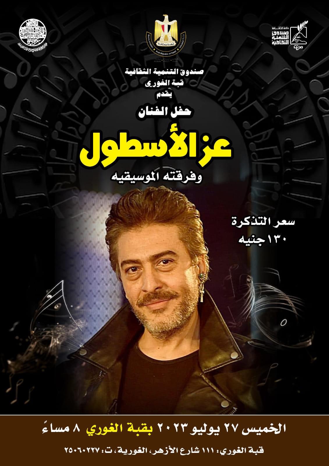 يقيم مركز إبداع قبة الغوري، والتابع لقطاع صندوق التنمية الثقافية فى الثامنة مساء الخميس 27 يوليو الجارى حفل للفنان عز الأسطول وفرقته الموسيقية.