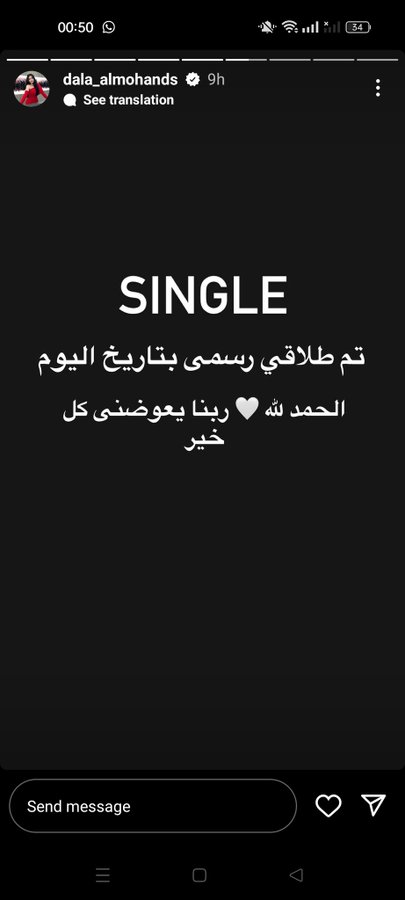 وقالت دالا المهندس عبر خاصية الاستوري بموقع الصور والفيديوهات انستجرام: “تم طلاقي رسميا بتاريخ اليوم، الحمدلله وربنا يعوضني كل خير”.