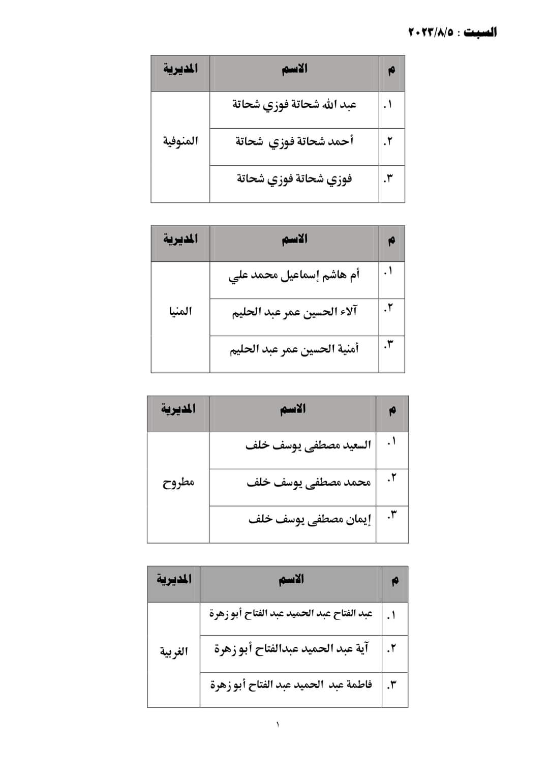 نشرت وزارة الأوقاف أسماء الأسر التي لها حق دخول الاختبار الشفوي المركزي المؤهل للمسابقة العالمية الثلاثين للقرآن الكريم، وذلك بمسجد الرحمة بجوار مقر ديوان عام الوزارة بباب اللوق، الساعة العاشرة صباحًا، مع ضرورة إحضار صورة الرقم القومي، وصورتين شخصيتين حديثتين، وذلك على النحو التالي: