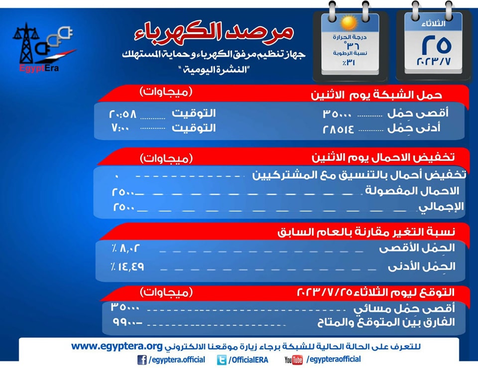 أكد مرفق جهاز تنظيم مرفق الكهرباء وحماية المستهلك، أن الأحمال الكهربائية المتوقعة على شبكة الكهرباء، اليوم الأربعاء، ستصل إلى 35 ألف ميجاوات على الرغم من عمليات تخفيف الأحمال التي تقوم بها الشركة، وذلك بسبب الموجة الحارة التي تضرب محافظات الجمهورية وادت إلى ارتفاع الأحمال الكهربائية لأرقام قياسية تحدث للمرة الأولى في التاريخ.
