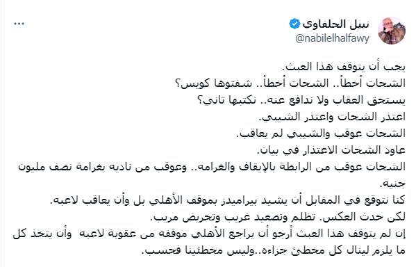 وكتب نبيل الحلفاوي تغريدة، عبر حسابه بتويتر، عن أزمة حسين الشحات "يجب أن يتوقف هذا العبث. الشحات أخطأ.. الشحات أخطأ.. شفتوها كويس؟ يستحق العقاب ولا ندافع عنه.. نكتبها تاني؟ اعتذر الشحات واعتذر الشيبي."