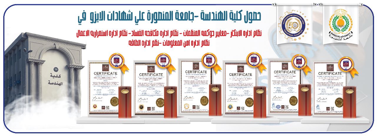 أعلنت جامعة المنصورة عن حصول كلية الهندسة علي ٦ شهادات أيزو جديدة في مجالات: