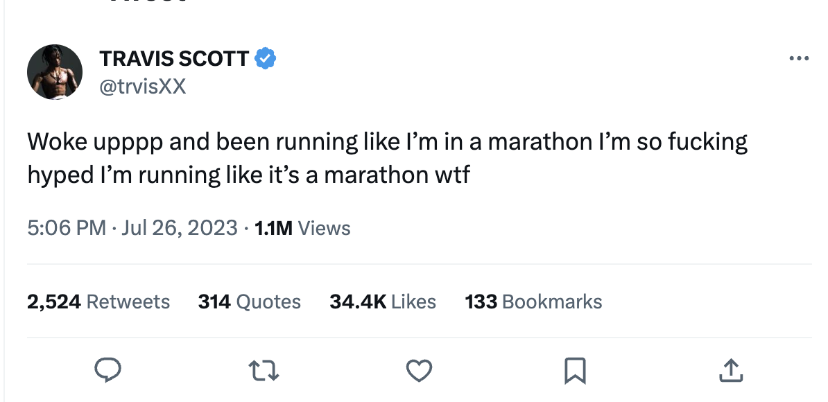 وكتب ترافيس سكوت قائلا: “استيقظت وكنت أركض، كما لو كنت في ماراثون، فأنا مسرور جدًا لأنني أركض مثل الماراثون”، وأنهي التغريدة بجملة اعتراضية أمريكية شهيرة، وهو ما جعل عددا كبيرا من متابعيه ومعجبيه، يربطون بين ما كتبه وبين إلغاء حفله في الأهرامات، خاصة أن ترافيس سكوت، قام بمحاولات مستميته لإقامة الحفل، من ضمنها إصدار بيان تفصيلي يدافع فيه عن نفسه ويرد، علي جميع المخاوف التي تمنع إقامة الحفل، ليفاجئ بالقرار النهائي وهو إلغاء الحفل.