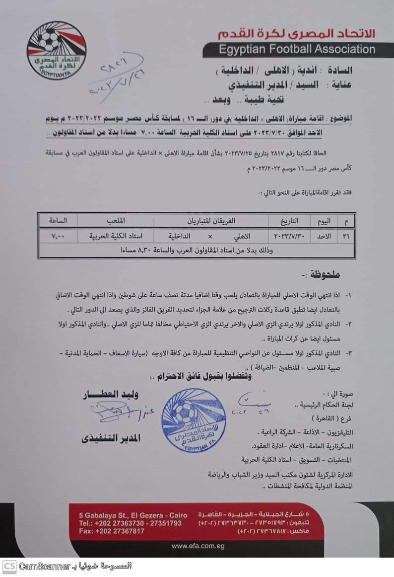 ورفض اتحاد الكرة، طلب نادي الداخلية بتأجيل مباراة الأهلي والداخلية في دور الـ 16 من بطولة كأس مصر والمقرر لها يوم 30 يوليو في موعدها.