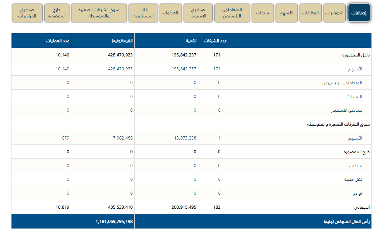 تباينت مؤشرات البورصة بختام تعاملات أمس الاربعاء، وربح رأس المال السوقي 3 مليارات جنيه ليغلق عند مستوى 1.169 تريليون جنيه، وهبط مؤشر "إيجي إكس 30" بنسبة 0.48% عند مستوى 17396 نقطة، وهبط مؤشر "إيجي إكس 50" بنسبة 0.24% عند مستوى 3169 نقطة، بينما ارتفع مؤشر الشركات الصغيرة والمتوسطة "إيجي إكس 70 متساوي الأوزان" بنسبة 1.08% عند مستوى 3457 نقطة، كما صعد مؤشر "إيجي إكس 100 متساوي الأوزان" بنسبة 1.25% عند مستوى 5115 نقطة.