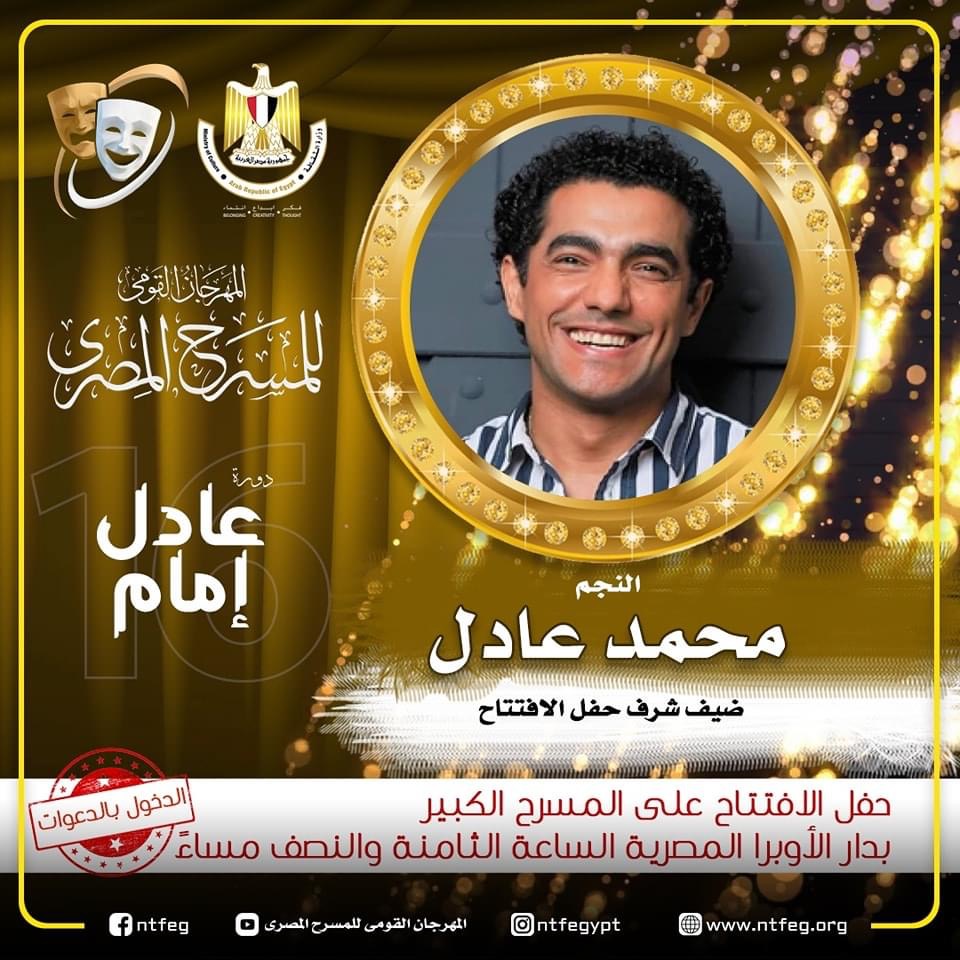 يستضيف المهرجان القومي للمسرح المصري في حفل افتتاح دورته السادسة عشرة برئاسة الفنان محمد رياض، الفنان محمد عادل، ليكون ضيف شرف الافتتاح والمقرر إقامته يوم السبت المقبل الموافق 29 يوليو الجاري على المسرح الكبير بدار الأوبرا المصرية.