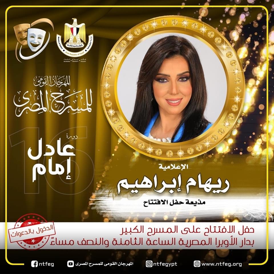 تقدم الإعلامية ريهام إبراهيم حفل افتتاح المهرجان القومي للمسرح المصري في دورته السادسة عشرة، برئاسة الفنان محمد رياض، وذلك يوم السبت المقبل الموافق 29 يوليو الجاري، بدار الأوبرا المصرية.