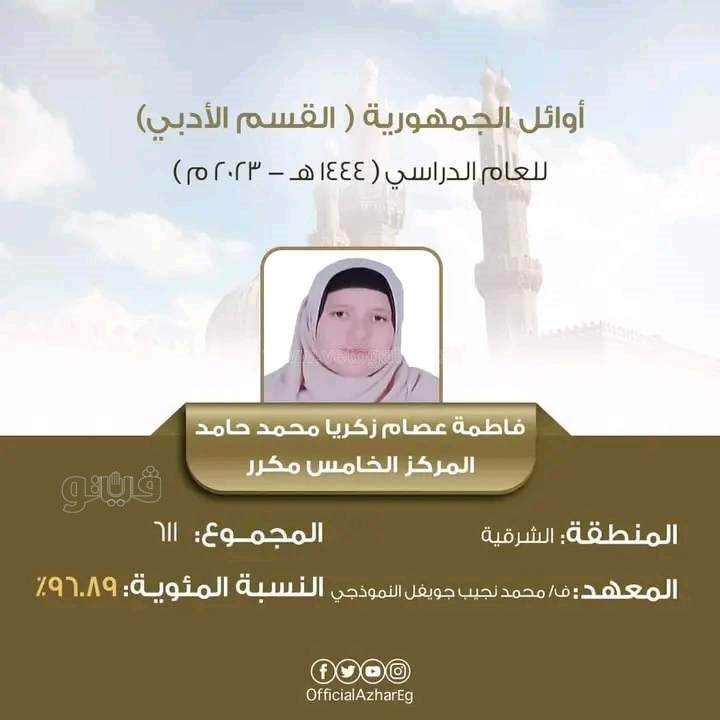 الخامس مكرر: فاطمة عصام زكريا، فتيات محمد نجيب جويفل النموذجي بالشرقية، بنسبة 96.98٪