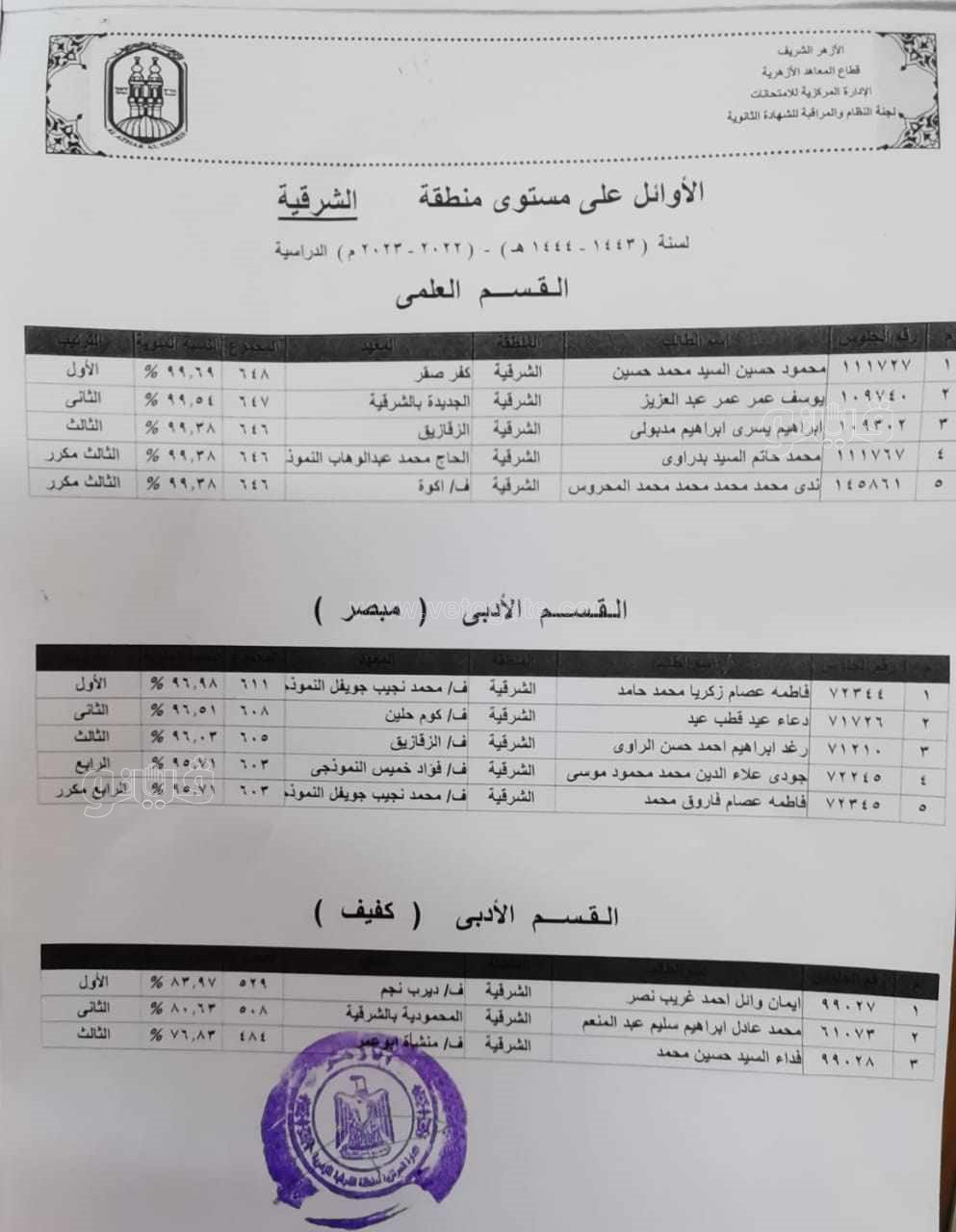قائمة أوائل نتيجة الثانوية الأزهرية 2023 في محافظة الشرقية