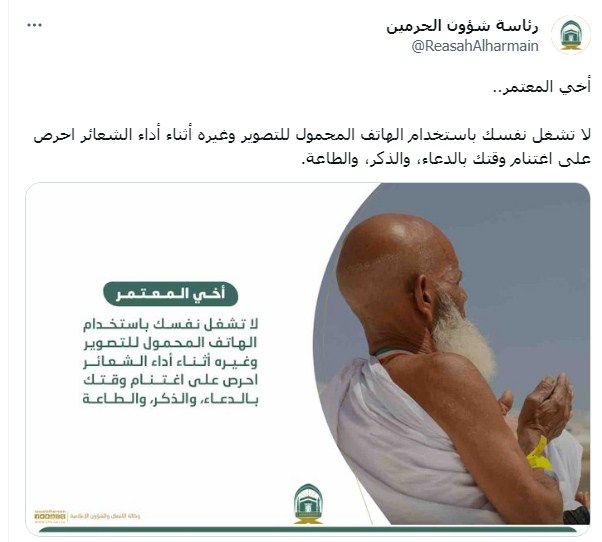 عمرة عاشوراء، وجهت رئاسة شئون الحرمين رسالة جديدة لمعتمري عاشوراء، طالبتهم فيها بعدم انشغالهم باستخدام الهاتف المحمول في التصوير أثناء أداء شعائر العمرة.