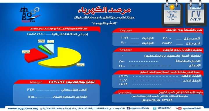 وأضاف مرفق جهاز تنظيم الكهرباء وحماية المستهلك أنه تم تخفيف الأحمال بمقدار 2500 ميجاوات نتيجة خطة الأحمال التي تقوم بها وزارة الكهرباء والطاقة تزامنا مع الموجة الحارة التي تضرب محافظات الجمهورية.