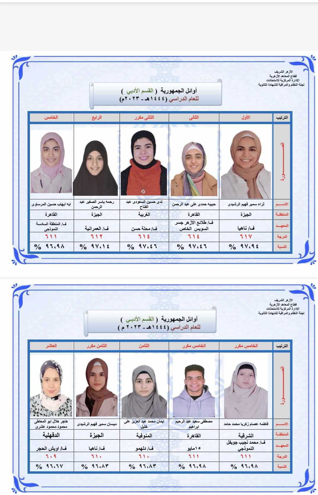 الأول: أسماء عبد الله عبد الله محمد السماحي، معهد فتيات أبو زيادة بكفر الشيخ، مجموع (649)، بنسبة 99.85%.