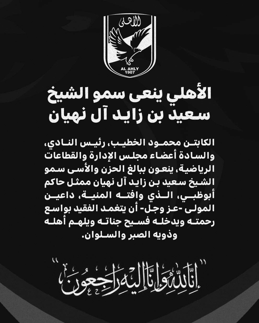 نعى النادي الأهلي رئيس مجلس حكماء المسلمين، الشيخ سعيد بن زايد ممثل حاكم أبوظبي، أخو الشيخ محمد بن زايد آل نهيان رئيس دولة الإمارات العربية المتحدة.