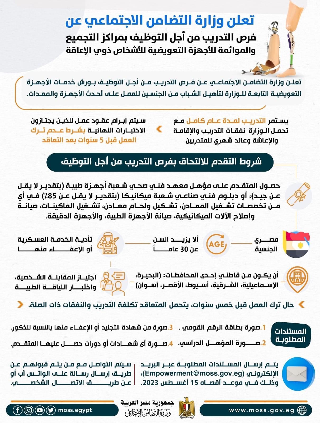تعلن وزارة التضامن الاجتماعي فرص التدريب بمراكز التجميع والموائمة للأجهزة التعويضية للأشخاص ذوي الإعاقة.