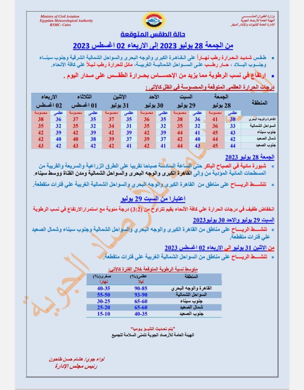 وأعلنت هيئة الأرصاد الجوية حالة الطقس المتوقعة من اليوم الجمعة ٢٨ يوليو إلى الأربعاء ٢ أغسطس ٢٠٢٣.