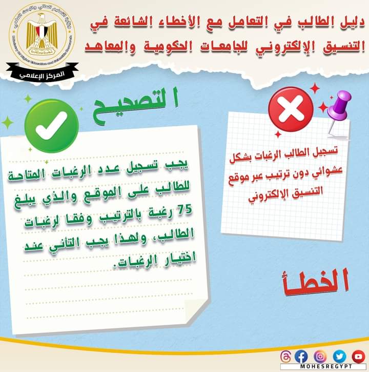 وأضاف أن الدليل الحالي يرصد أبرز الأخطاء الشائعة في التنسيق الإلكتروني التي يقع فيها طلاب الثانوية العامة، ويتناول الدليل الإرشادي كيفية تصويب هذه الأخطاء حتى يتجنب الطلاب الوقوع فيها، خلال فترة التنسيق للالتحاق بالجامعات الحكومية والمعاهد.