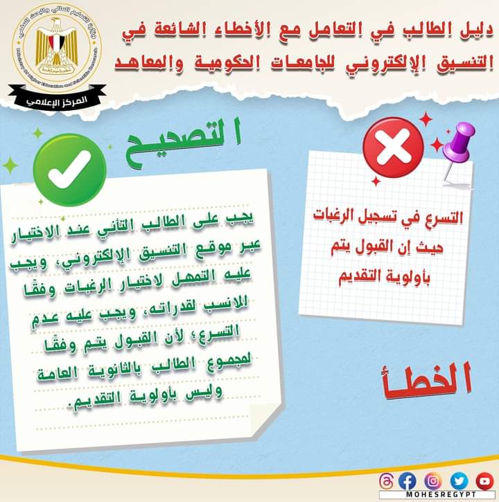 وناشدت وزارة التعليم العالي بوسائل الإعلام المختلفة، نشر الأدلة الإرشادية والوسائل التوضيحية للطلاب؛ لتعريفهم بها خلال فترة التنسيق الإلكتروني للجامعات الحكومية والمعاهد.