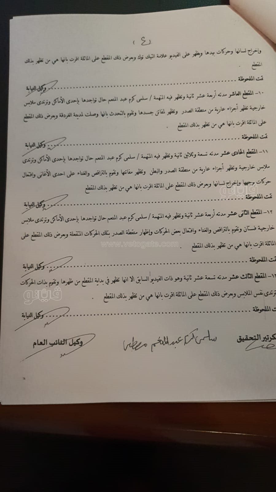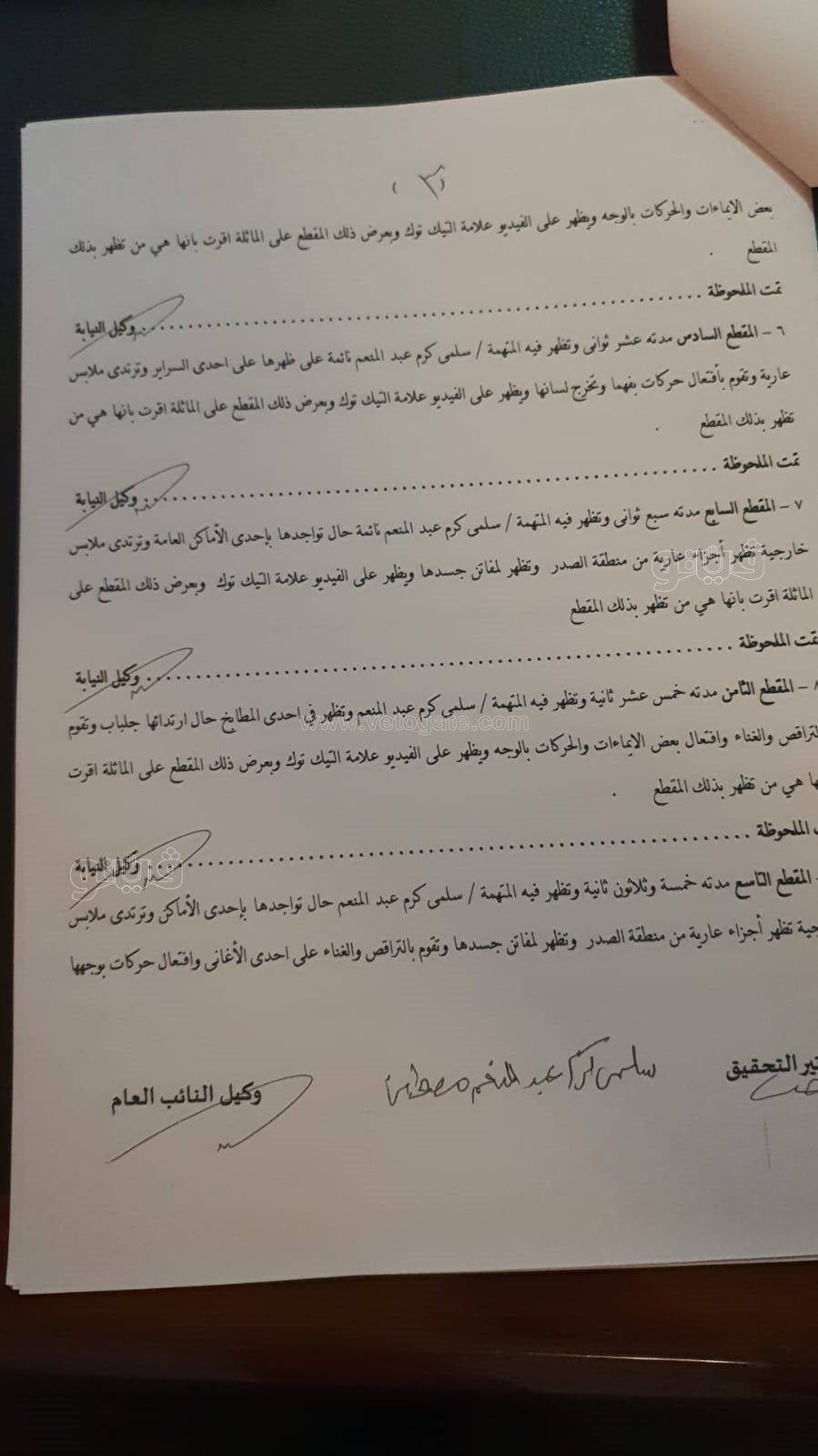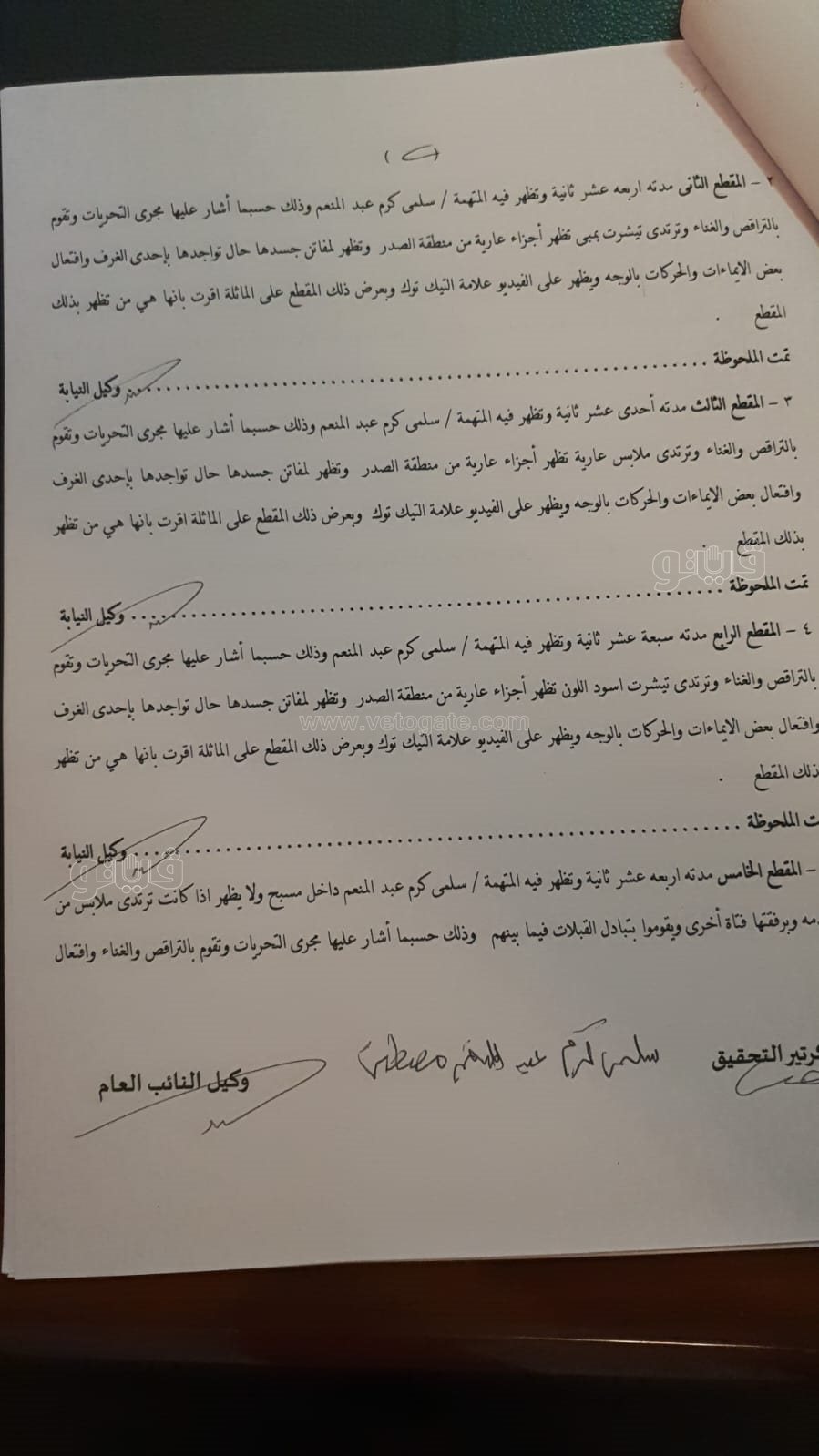 وأضافت التحقيقات والتي حصلت فيتو على نسخة ضوئية منها، أن المقطع الثاني جاء كالتالي: مدته أربعة عشر ثانية وتظهر فيه المتهمة، وتقوم بالتراقص والغناء وترتدي تيشرت بمبي تظهر أجزاء عارية من منطقة الصدر وتظهر لمفاتن جسدها حال تواجدها بإحدي الغرف وافتعال بعض الإيماءات والحركات بالوجه ويظهر على الفيديو علامة التيك توك.