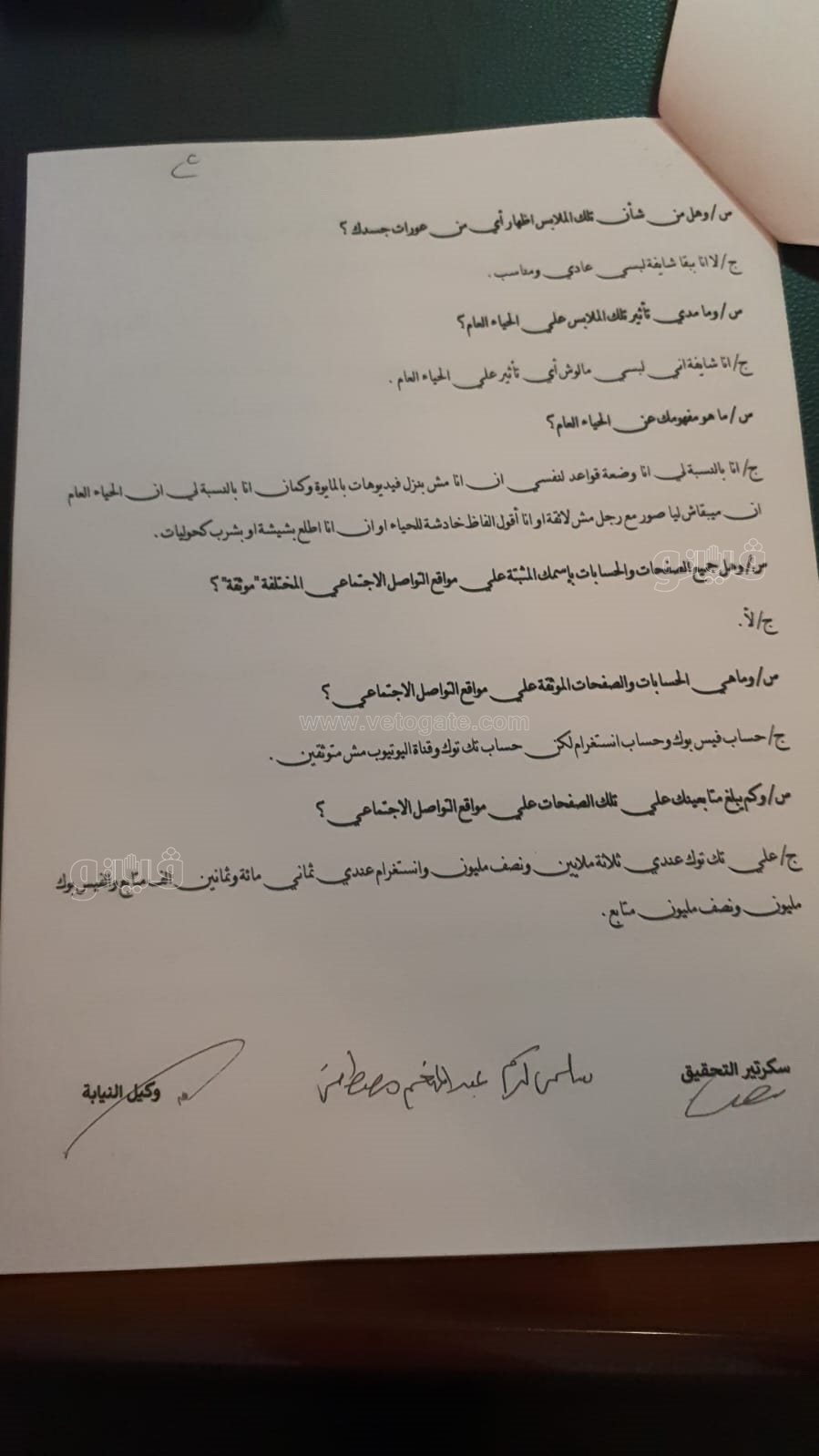 وجاءت اعترافات المتهمة أمام النيابة العامة كالتالي: عند سؤالها عن مدى إتاحة المحتويات التي يتم تداولها عبر حساباتها الشخصية: أجابت بأن تلك الصفحات والمحتويات متاحة للجميع ولكن على موقع التيك توك بيقوم الموقع بإخبارها إذا كانت تريد تحديد المحتوى للعامة أم لفئة عمرية محددة، وأنا بختار فئة البالغين وبستثني الأطفال.